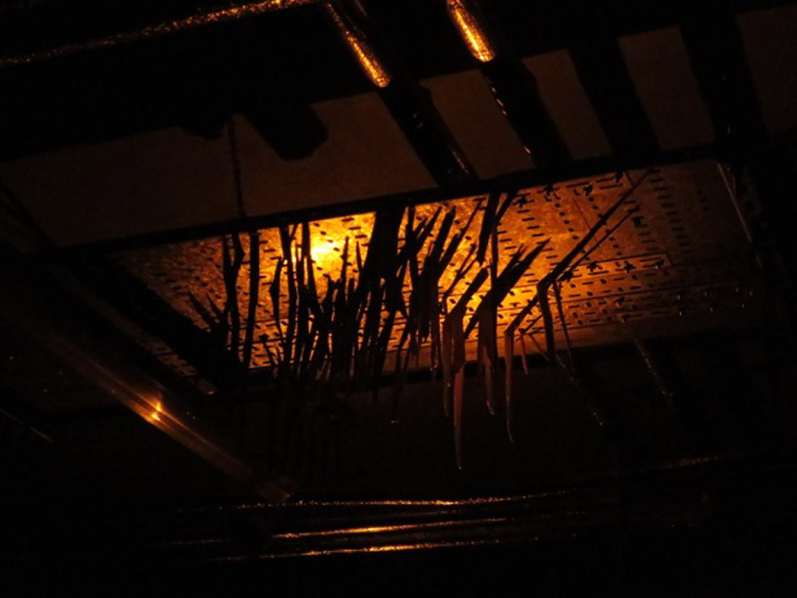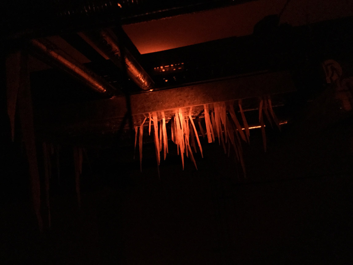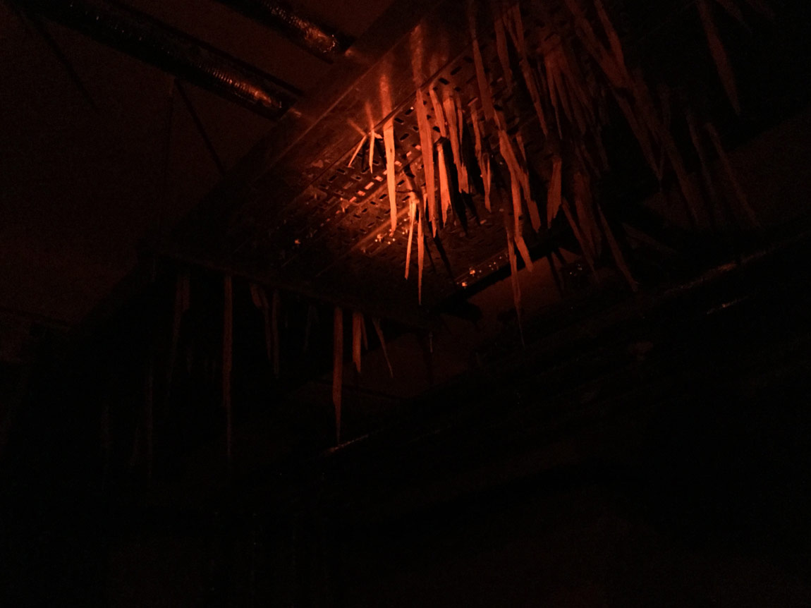 strains / St George's Hall Stalactites from axed wooden crates, torch, brake light tape Installation, performance |